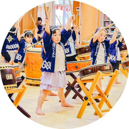 和太鼓を通じ、リズム感や協調性を育みながら、知育の伝統文化への親しみを深めています。