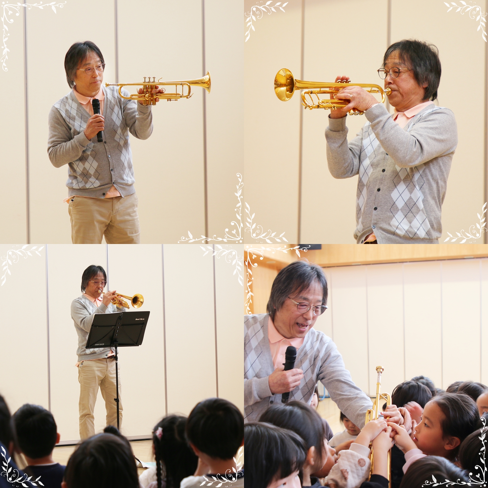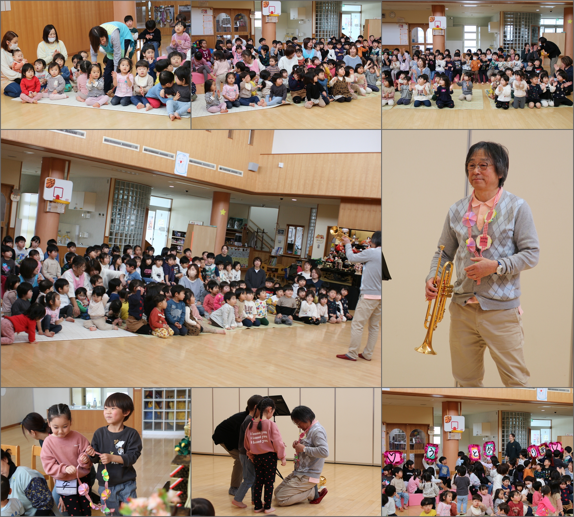2月の誕生会。トランペット奏者の黒田さんをお招きし、コンサートが開かれました。 曲によって、感動したり、優しい気持ちになったり、ワクワク嬉しくなったり・・・ トランペットを近くで見聴きし、どうして音出るのか教えていただき、触らせてもらい、身近に感じる機会となりました。
